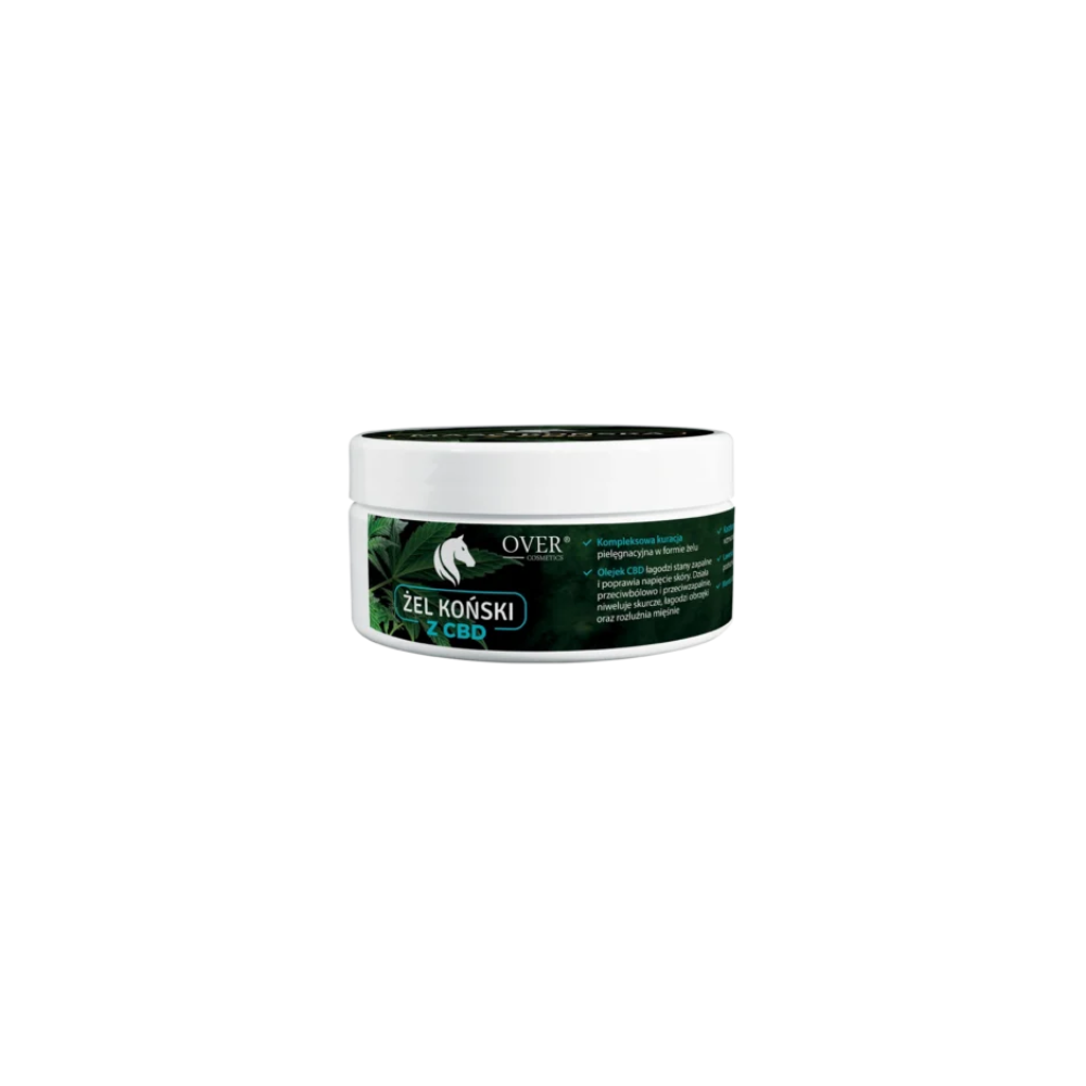 ŻEL KOŃSKI Z CBD to produkt naszej marki kosmetycznej OVER Cosmetics. Żel wywołuje uczucie chłodu i działa znieczulająco. Z tego względu polecany jest przy nerwobólach i zapaleniach ścięgien. Wykazuje działanie przeciwreumatyczne i antyseptyczne. Kasztanowiec i nagietek wzmacniają naczynia krwionośne, lawenda i arnika łagodzą dodatkowo podrażnienia, a zawartość mentolu zapewnia przyjemne uczucie chłodu i odświeżenia. Olejek CBD zawarty w żelu wspiera procesy regeneracyjne, niweluje napięcie mięśniowe, a także łagodzi obrzęki, przynosząc ulgę w przypadku zakwasów. Poprawia jędrność skóry. Olejek CBD przyspiesza proces regeneracji za sprawą aktywacji receptorów kannabinoidowych. Jest bogaty w witaminy, fosfolipidy, fitosterole i minerały.