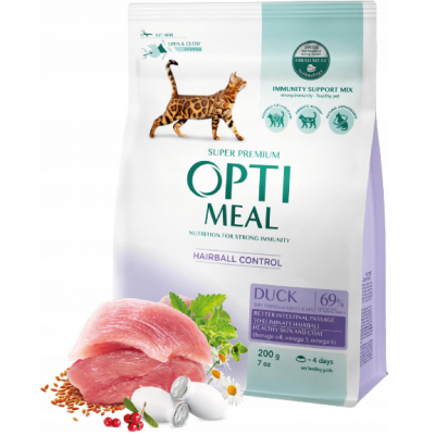Optimeal dla dorosłych kotów z efektem pozbywania się sierści, kaczka — super premiowa karma dla dorosłych kotów z tendencją do powstawania grudek sierści w żołądku, produkowana pod kontrolą lekarzy weterynarii. Wyjątkowa receptura dla zdrowia i urody zwierzęcia zawiera wyselekcjonowane mięsne składniki, przydatne zioła, jagody, naturalne przeciwutleniacze i prebiotyki.