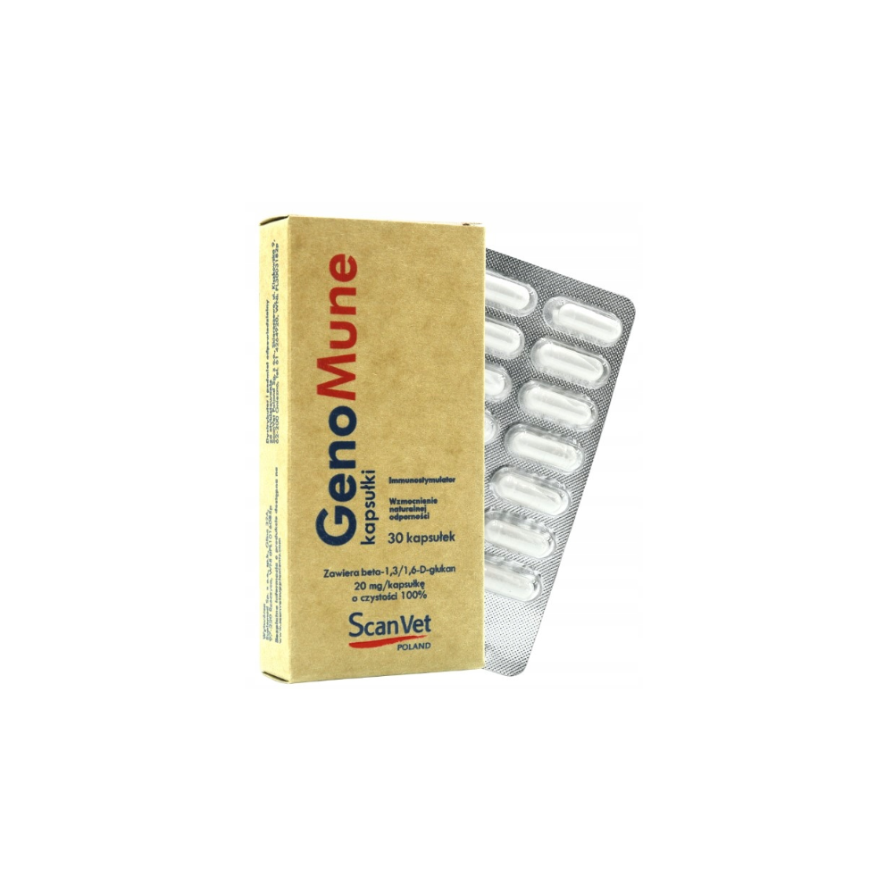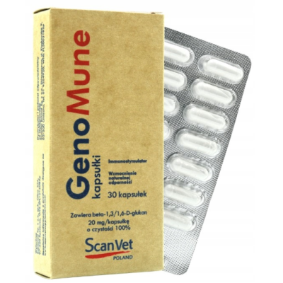 Produkt Genomune kapsułki zawiera opatentowany beta-1,3/1,6-D-glukan izolowany z grzybów Pleurotus ostreatus. Produkt nie zawiera barwników, konserwantów ani aromatów. Może być stosowany u zwierząt z alergiami oraz z cukrzycą. Beta-1,3/1,6-D-glukan zawarty w GenoMune kapsułki to substancja całkowicie naturalna, poddana zabiegom technologicznym mającym na celu uzyskanie najwyższego stopnia oczyszczenia. Beta-1,3/1,6-Dglukan zawarty w GenoMune kapsułki swoiście oddziałuje z receptorami błonowymi makrofagów (które stanowią pierwszą linię obrony niszcząc komórki patogenów), komórek NK, limfocytów oraz neutrofili, stymulując ich aktywność fagocytarną i produkcję cytokin. Struktura beta-1,3/1,6-D-glukanu zawartego w GenoMune kapsułki idealnie pasuje do receptorów, powodując pobudzenie tych komórek i wzrost ich aktywności.