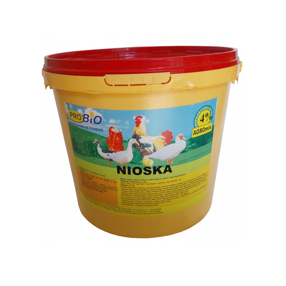 ProBio Agromix Nioska uzupełnia niedobory witaminowo-mineralne u niosek ,zwiększając przyswajalność paszy oraz poprawiając jej walory dietetyczno-smakowe. Skorupki jajek staja się twarde a żółtko ma wyrazisty kolor.